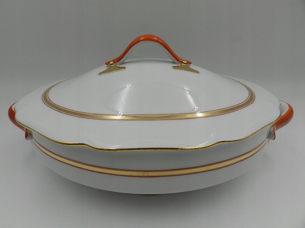 Елегантна біла порцеляна з витонченими рельєфами у формі позолочених бантів, які доповнюють помаранчеві ручки. Весь овальної форми, краї кришки і ніжка тераріуму злегка хвилясті, виділені золотими облямівками. Незвичайний предмет, що характеризується впливом ар-деко, характерним для цього періоду.