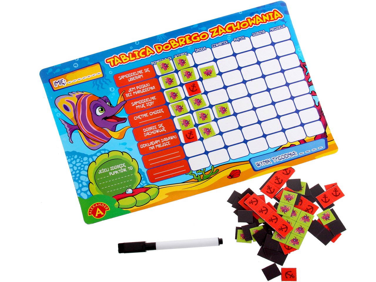 Система балів: дошка оснащена магнітними значками з чарівним зображенням усміхненої рибки, які представляють бали за хорошу поведінку. Крім того, для запису негативної поведінки використовуються магнітні мітки з якорем на червоному тлі. Це дає змогу відстежувати прогрес вашої дитини у формуванні позитивних звичок.