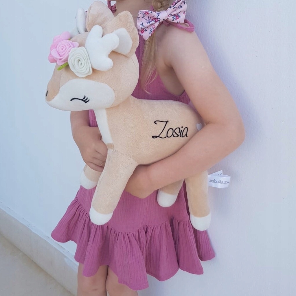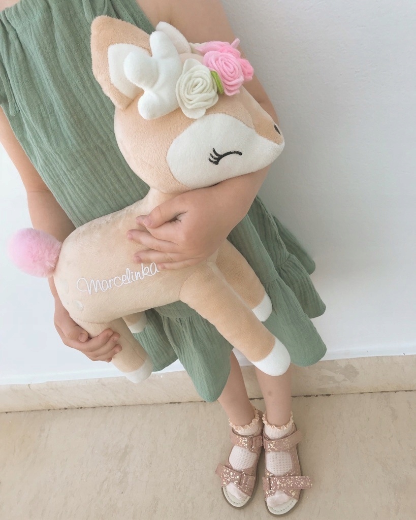 Олень милий, його легко тримати, його також можна поставити на полицю. Тут є все, що люблять маленькі дівчатка. Милі квіти, усміхнені очі та ніс у формі серця зроблять цей талісман кращим другом вашої дочки. Версія з вашим ім'ям залишиться сувеніром на все життя.
