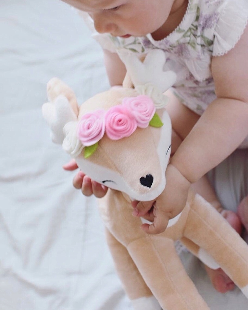 Милий плюшевий олень із пастельними квітами на голові та милим хвостиком — ідеальна м’яка іграшка для маленької дівчинки будь-якого віку.