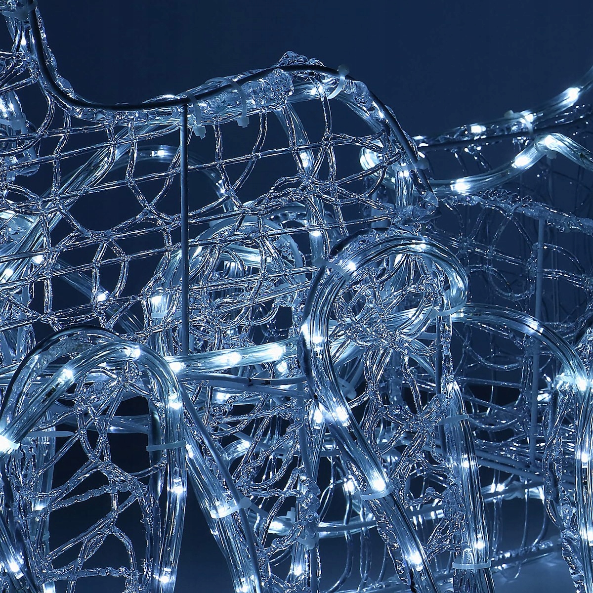 Міцна, гнучка кришка легкого ланцюга має товщину майже 9 мм і має клас IP44 це параметр, який вказує на те, що ви можете легко розмістити світлодіодних оленів як всередині, так і зовні будинку - в саду, на терасі, балконі. У набір також входять металеві кілочки, за допомогою яких можна прикріпити оленя і сани до землі. Стійка металева конструкція забезпечує постійну форму інсталяції.