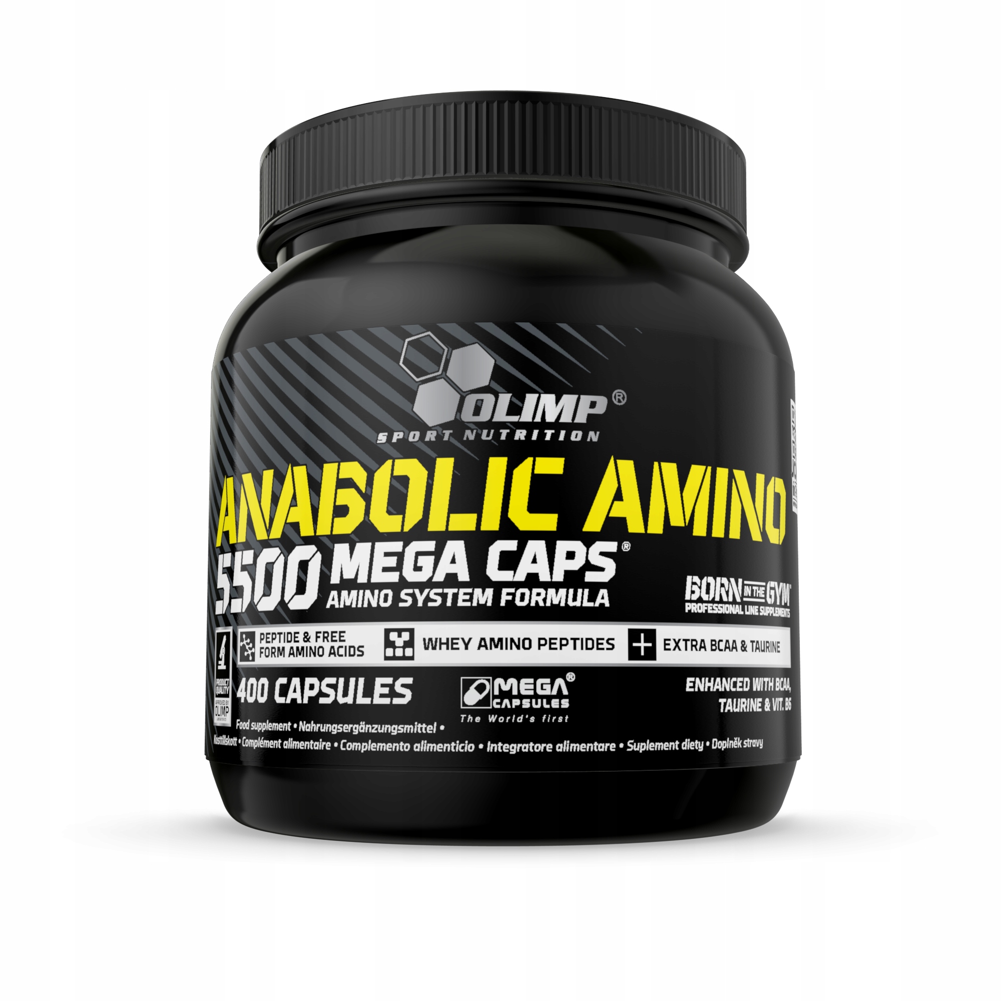 ANABOLIC AMINO 5500 MEGA CAPS®/MEGA CAPSULES® Дієтична добавка, що містить комплекс пептидів і безкоштовний амінокислот у формі капсул, з додатковим резервом амінокислот з розгалуженим ланцюгом BCAA, таурину та вітаміну B6.