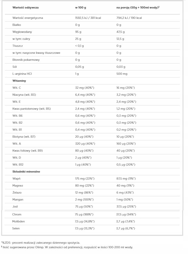 OlimpCarbonox™ - це дієтична добавка, яка завдяки інгредієнтам, які вона містить, дозволяє забезпечити енергію, необхідну для тренувань, і енергію, втрачену під час тренувань! Наступник Olimp Carbo® - найкращого вуглеводного продукту за останні десятки років. Тепер ще кращий, збагачений склад! Дізнайтеся про це! І ви не залишитеся без енергії!