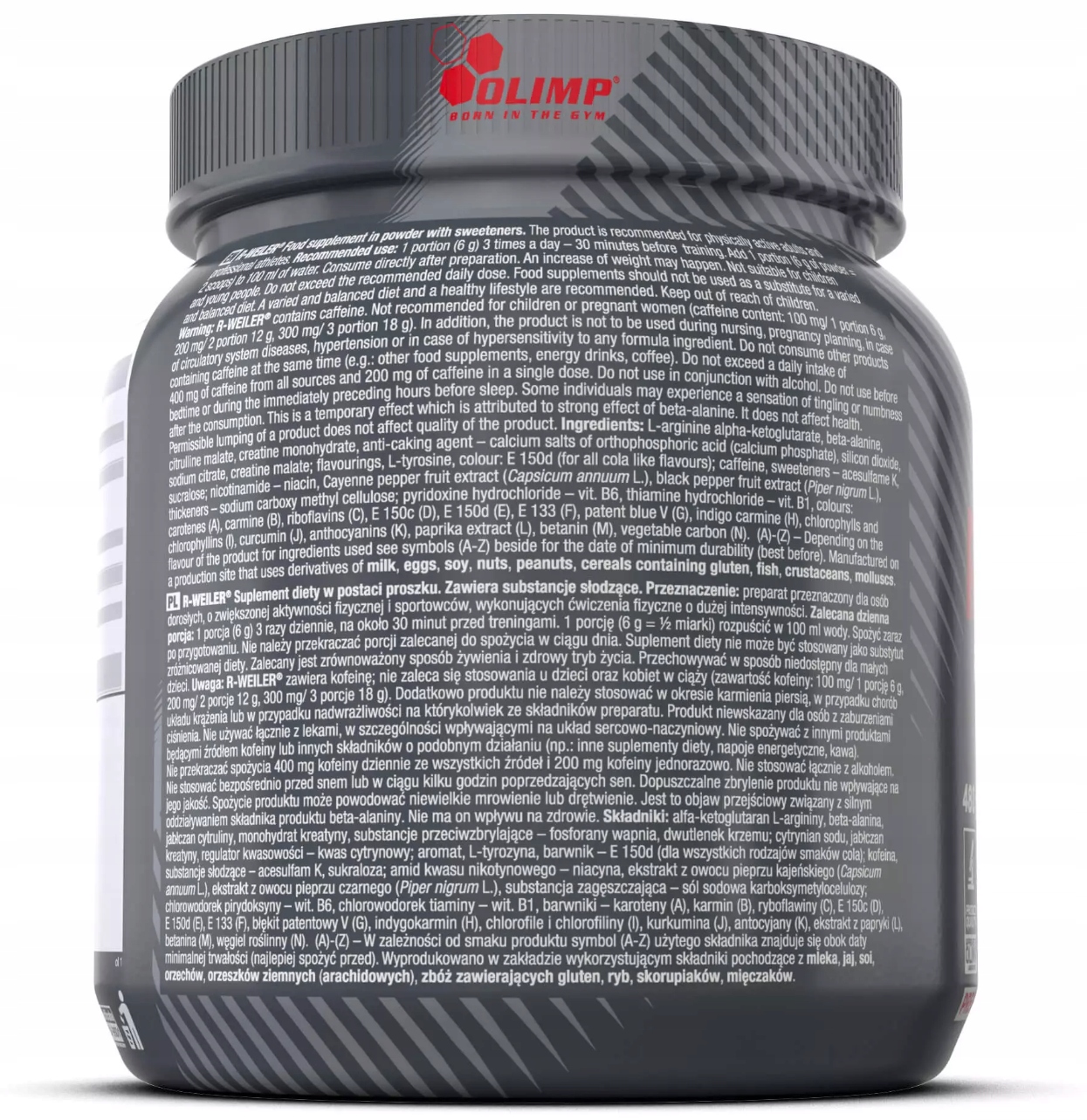 зробити крок вперед до встановленої мети! Виберіть olimp r-weiler® -pre-тренування, що дозволяє підготувати чудові умови для ефективного формування м’язової, естетичної фігури! Це підготовка, рекомендована для дорослих, які практикують рекреаційно або є професійними спортсменами, які люблять інтенсивно тренуватися. Одну частину добавки (6 г - ½ заходів) слід розчинити в 100 мл води і споживати 3 рази на день приблизно за 30 хвилин до запланованого навчання. Продукт слід вживати відразу після підготовки. Упаковка препарату містить 300 г порошку, що легко розчинне, що відповідає 50 активним порціям! 4