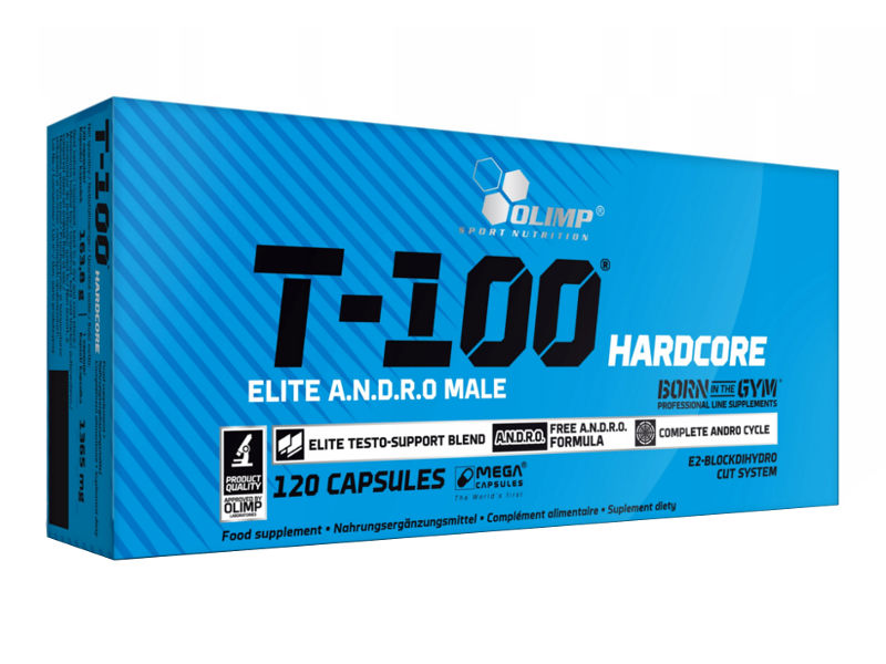 Друга версія новаторського T-100®, цього разу у версії HARDCORE з набагато сильнішою композицією та точнішою дією. З появою першого T-100® з логотипом Olimp Sport Nutrition® закінчилася ера популярності однокомпонентних Т-бустерів і настала абсолютно нова ера почалися складні вироби. Механізм їх дії заснований не тільки на збільшенні вироблення тестостерону, а й на максимальному збільшенні його вільної форми в крові за рахунок зменшення перетворення в метаболіти з небажаним спектром дії.