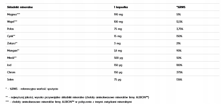 Інгредієнти: бісгліцинат магнію** (хелат амінокислоти магнію), оксид магнію, бісгліцинат кальцію** (хелат амінокислоти кальцію), хлорид калію, карбонат кальцію, бісгліцинат цинку** (хелат амінокислоти цинку), наповнювач - целюлоза мікрокристалічна; антизлежувач - магнієві солі жирних кислот; бісгліцинат марганцю** (хелат амінокислоти марганцю), селенат натрію (IV), бісгліцинат заліза (II)** (хелат амінокислоти заліза), бісгліцинат міді** (хелат амінокислоти міді), хлорид хрому (III), йодид калію , капсула (склад оболонки - желатин, барвники: Е 132, Е 171).