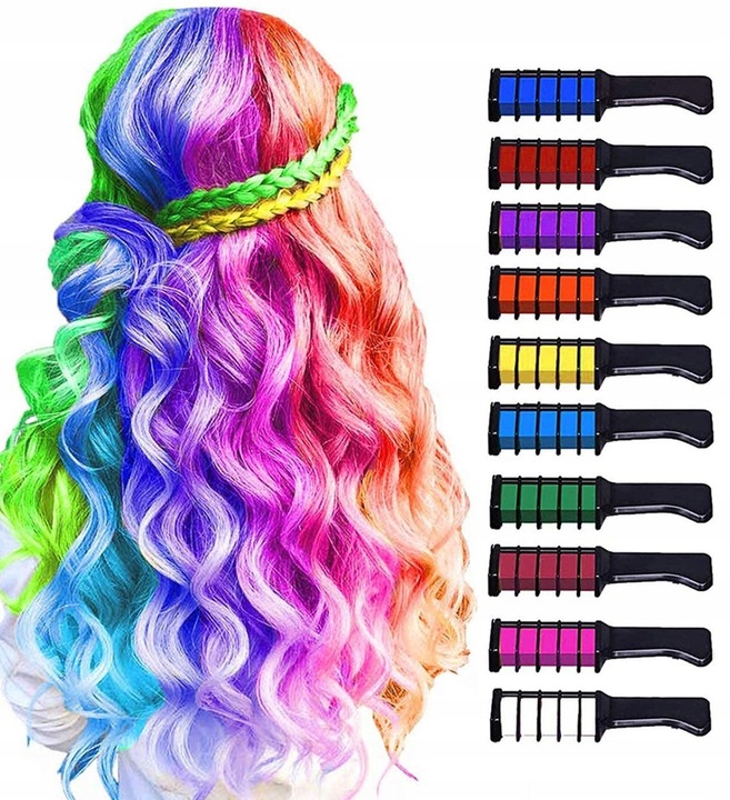 Набір містить 10 крейд для волосся, які можна мити яскравих і насичених кольорів, і 12 крейд для малювання обличчя різноманітних відтінків веселки.