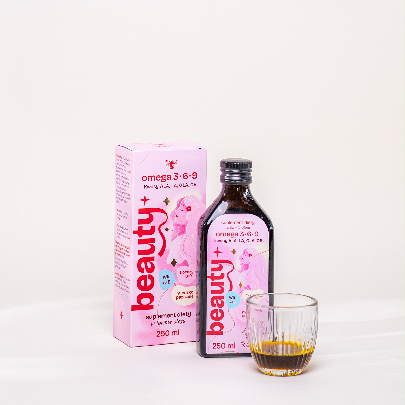 Be Beauty+ із силою Омега 3, 6 і 9 кислот рослинного походження - з конопляної олії, насіння чорної смородини, огірочника, обліпихи та примули вечірньої. Це ідеально збалансована композиція рослинних властивостей, яка, збагачена вітаміном А, вітаміном Е, коензимом Q10 і маточним молочком, забезпечує повну, гармонійну підтримку Вашій шкірі, піклуючись про її стан і сяючий вигляд! Збагатіть свій щоденний раціон порцією Beauty+ у вигляді олії з чудовою засвоюваністю, чудовим смаком полуниці та відчуйте своє сяйво, яке тече зсередини!
