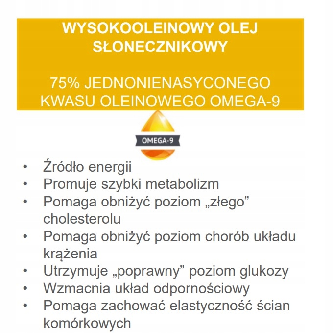 Переваги продукції:• Містить понад 75% корисних мононенасичених жирних кислот Омега-9• Містить Омега-6 і Омега-3• Стійкість до окислення: олія не гірчить, має довший термін зберігання• Ідеально підходить для смаження при високих температурах• Зберігає природний смак продуктів при варінні• Менше поглинається продуктом під час смаження• Висока температура димлення - 235°С