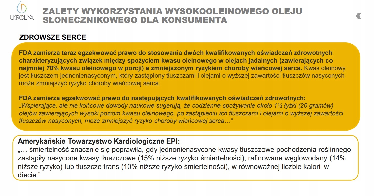 Чим виділяється високоолеїнова соняшникова олія (HOSO)? HOSO (High Oleic Sunflower Oil) — це соняшникова олія, отримана з насіння соняшнику з високим вмістом олеїнової кислоти з високим вмістом олеїнової кислоти Омега 9 (мононенасичені жирні кислоти) і низьким вмістом лінолевої кислоти Омега 6 (поліненасичені жирні кислоти). Масло, отримане з нього, цінно вітаміном Е і омега-9 кислотами, які необхідні для багатьох біохімічних процесів, що відбуваються в організмі. HOSO подібна до оливкової олії за складом жирних кислот. Водночас високоолеїнова соняшникова олія має ще більший вміст олеїнової кислоти понад 82%. Для порівняння: в оливковій олії – 70%.