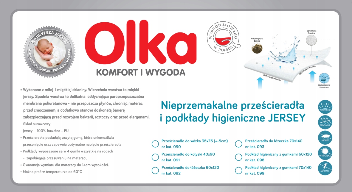 Виготовлений з приємної та м'якої тканини. Верхній шар - м'який трикотаж. Нижній шар - це ніжна, дихаюча, паропроникна поліуретанова мембрана - вона не пропускає рідини, захищаючи матрац від намокання, а також забезпечує відмінний бар'єр для розвитку бактерій, кліщів і алергенів.