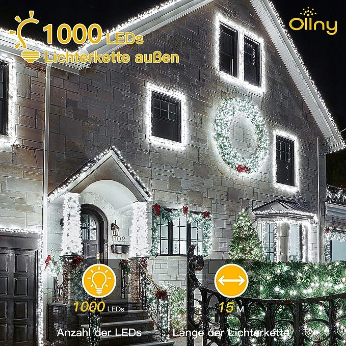 Олльні різдвяні вогні, 15 м, 400 світлодіодів, вуличний ліхтар, 8 режимів роботи, таймер, водонепроникний, ліхтарик, ялинка, холодний білий, з вилкою, для зовнішнього використання всередині , на Різдво