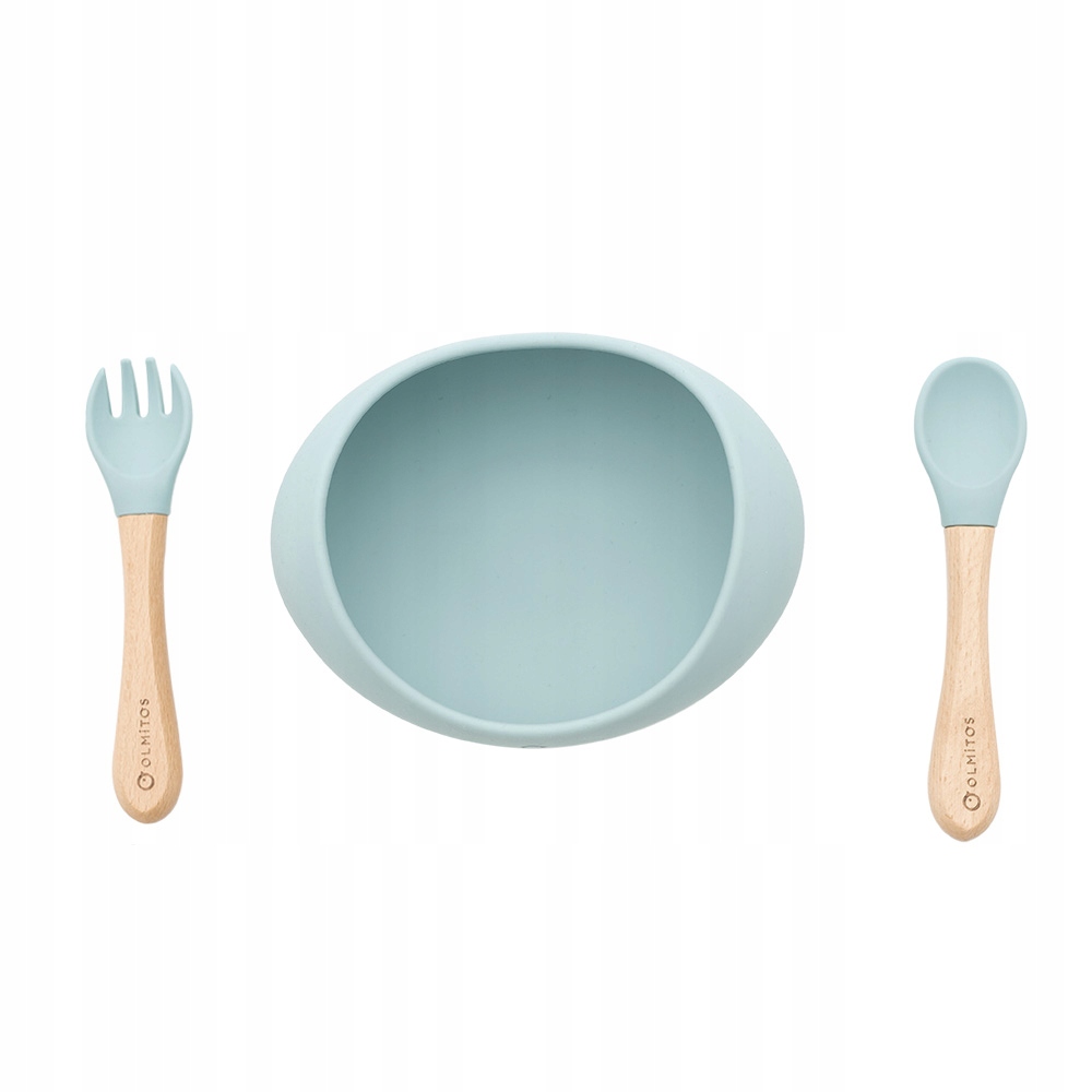 Обідній набір з 3 предметів від іспанського бренду OLMITOS. Ідеально підходить для використання при розширенні раціону дитини. Виготовлений з високоякісного 100% харчового силікону, що відповідає суворим німецьким вимогам LFGB. Чаша має міцну присоску, яка запобігає висипанню її вмісту під час їжі. Спеціальний язичок полегшує від'єднання присоски. Столові прибори мають закруглені та м'які краї, щоб не дратувати ніжні ясна малюка. Їхні ручки виготовлені з деревини бука.