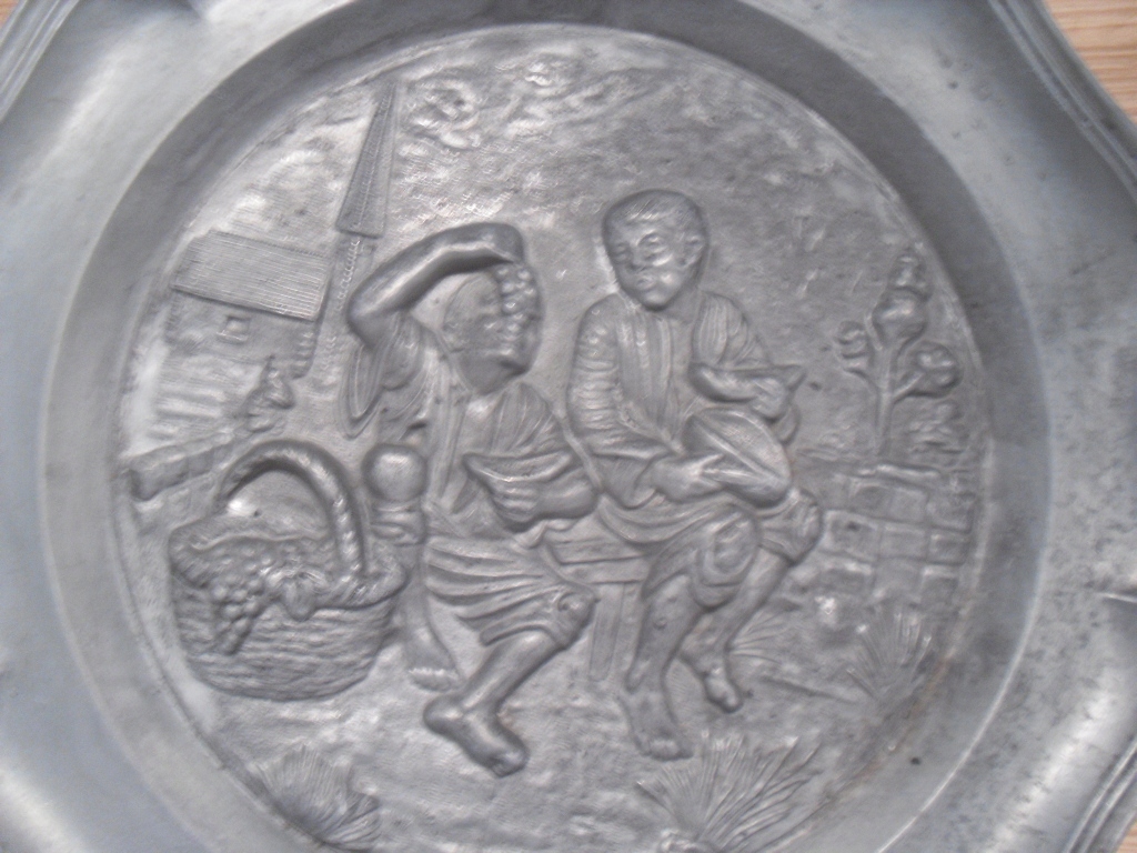 Олов'яна тарілка стара тарілка, що зображує сцену з села, підписаний ангелом
