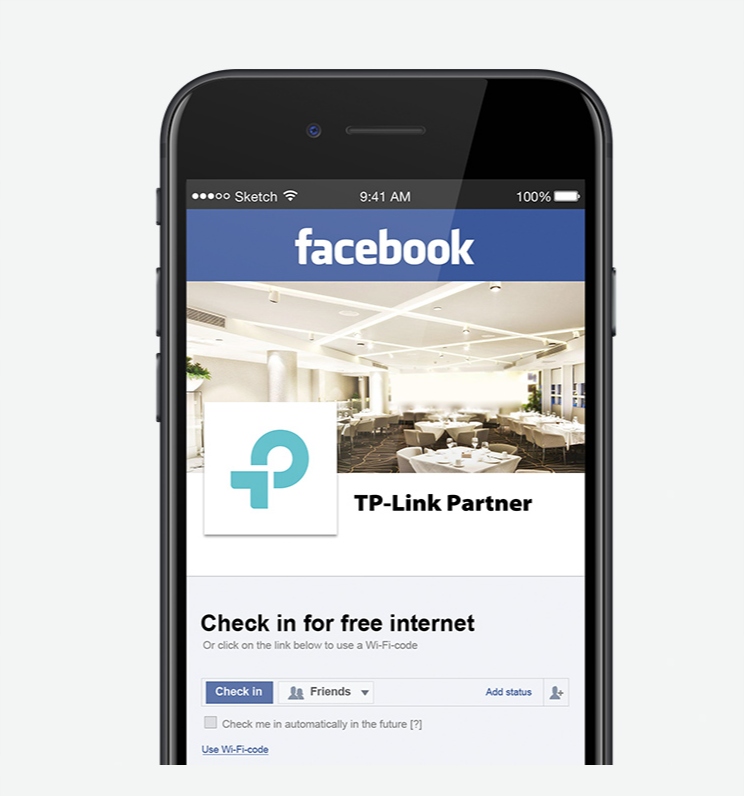 Гості можуть безпечно входити в мережу, зокрема: через сторінку привітання. Аутентифікація за допомогою SMS значно спрощує процес входу, а автентифікація через Facebook допомагає виділити профіль компанії в соціальних мережах.