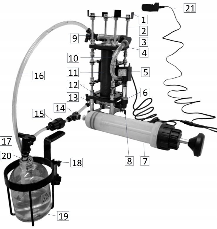 Інші елементи 18 -21: кошик для рідини, пляшка для рідини, жорстка трубка для рідини, джерело живлення 230 В