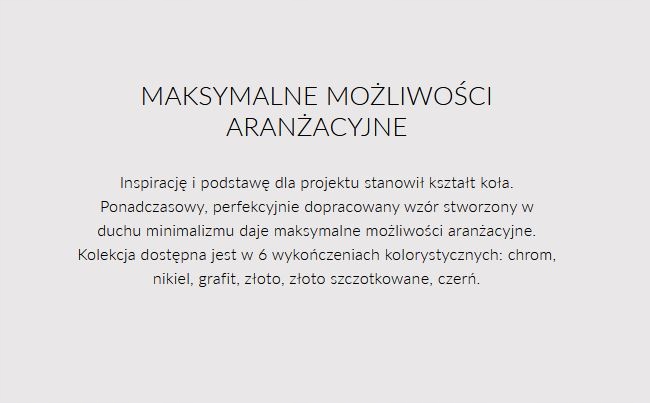 Натхненням і основою для дизайну стала форма кола. Непідвладний часу, ідеально вишуканий візерунок, створений у дусі мінімалізму, забезпечує максимальні можливості аранжування. Змішувач виготовлений з високоякісної латуні та оснащений найякіснішою керамічною головкою. Інноваційні технологічні рішення дозволяють скоротити споживання води вдвічі та забезпечити найвищий комфорт використання.