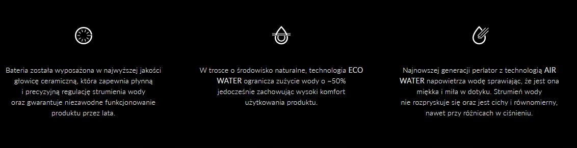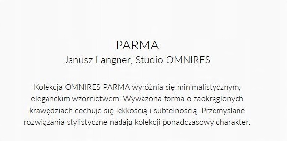 Колекція Parma Omnires відрізняється її мінімалістичною, елегантною конструкцією. Продумані стилістичні рішення дають колекції позачасового характеру. Змішувач оснащений керамічною головкою найвищої якості, а його тіло виготовляється з високоякісної латуні. Інноваційні технологічні рішення дозволяють зменшити споживання води вдвічі та забезпечити найвищий комфорт використання.