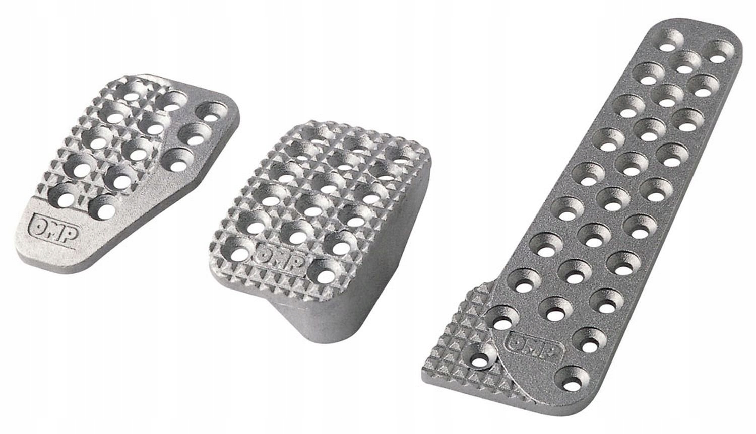 Набір професійних чохлів на педалі. Виготовлений компанією OMP Racing з піскоструминного алюмінію. Підписано вигравіруваним логотипом OMP. Завдяки високоякісній сировині та дбайливому підходу до виробництва вони значно відрізняються від накладок, які зазвичай доступні на ринку. В основному використовується в ралійних і тюнінгових автомобілях.