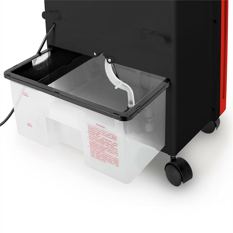 Пристрій не потребує занадто великого нагляду під час роботи, оскільки споживання води становить лише 1 літр на годину, так що резервуар достатньо, щоб заповнювати один раз на день. Дві доставлені вставки для охолодження по черзі підтримують повітряне охолодження. Прикріплений пульт дистанційного керування дозволяє повний контроль над кулером із сидячого або лежачого положення, не підходячи до нього. Ідеальні умови для насолоди прохолодним вітерцем.