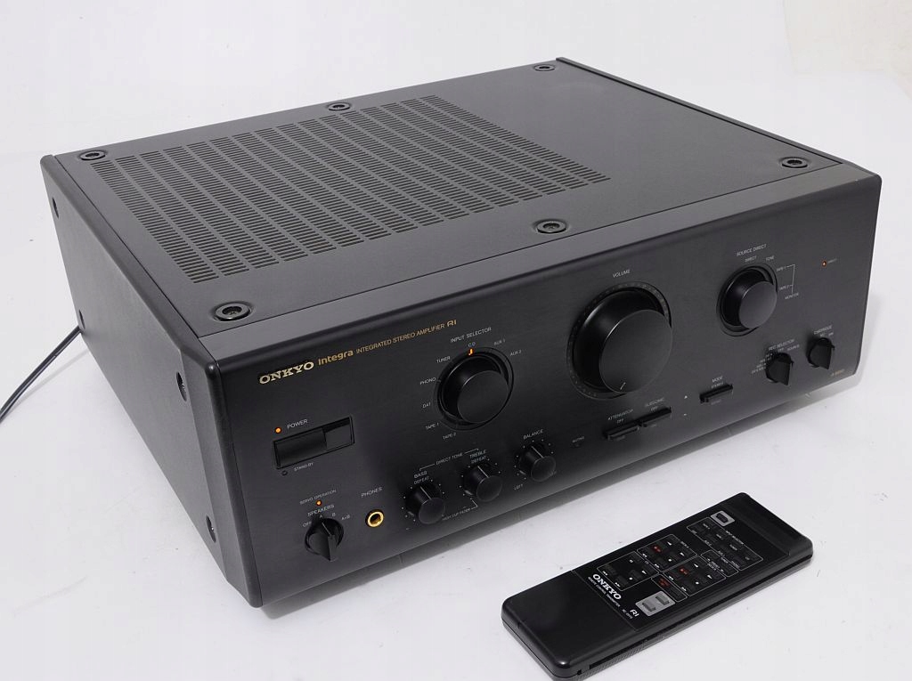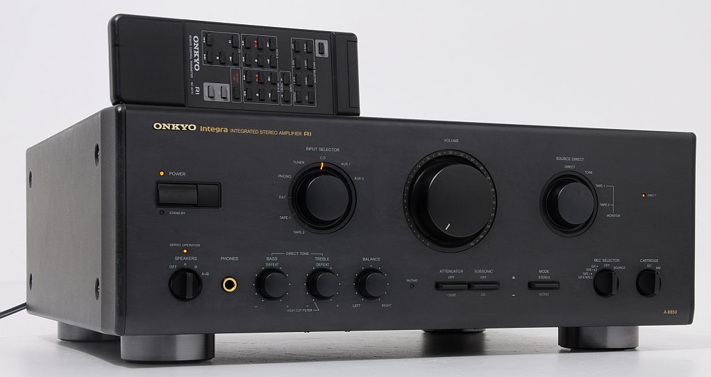 Еталонний підсилювач вищого класу Onkyo Integra A-8850. Перше, що впадає в око, це бездоганність виготовлення - точно підібрані комплектуючі, все зроблено з воістину педантичною увагою до деталей, що підтверджують відгуки користувачів на тематичних інтернет-форумах. Це обладнання японського виробництва, що само по собі говорить про пристрій добре. Підтвердженням надійності його виготовлення є значна вага – близько 15 кг(!). Ця модель є однією з флагманських (високобюджетних) розробок. Аудіофільське виконання, всі конденсатори NICHICON і в попередньому підсилювачі (аудіофільському) NICHICON MUSE, підсилювачі потужності транзистори японської фірми SANKEN, які вважаються найкращими в світі. Потенціометри ALPS, величезний трансформатор! Зовнішній вигляд - страхітливий - чистота форм, простота і класична обробка. Стільки про зовнішній вигляд і якість виготовлення, які є передчуттям його звуку. Підсилювач має дуже корисну функцію SOURCE DIRECT - звук йде прямо від джерела до підсилювачів потужності - немає зайвих фільтрів, потенціометрів, а отже, неминучих спотворень - якість звуку з компакт-диска приголомшлива. Попередній підсилювач має стандартні елементи управління - гучність, низькі частоти, високі частоти, функція відключення звуку -20 дБ, перемикач режимів моно/стерео, фільтр дозвуку. Обладнання має звуковий попередній підсилювач, сумісний з картриджами MM і MC. Джерело вибирається за допомогою цифрового перемикача з електромагнітів - це запобігає перехресним перешкодам між джерелами.
