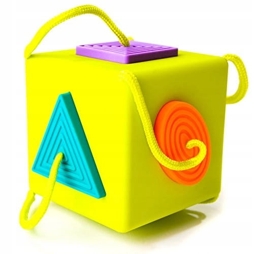 барвисті форми різної текстури, виготовленої з м'якого силікону, прикріпленого до міцної струни до пластикового куба. Шість форм ідеально вписуються у відповідні місця кубів сортів. Сортатор куба стимулює дітей віком від 6 місяців, а також ідеально підходить для гри та навчання на подорожах.