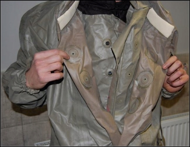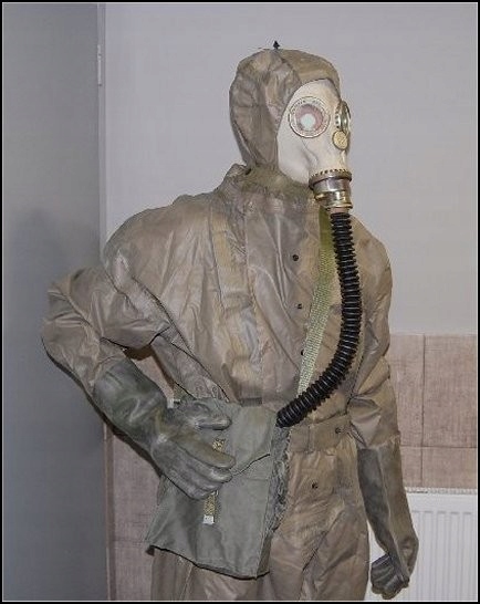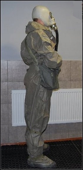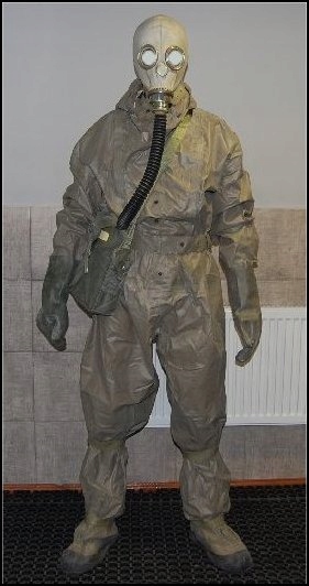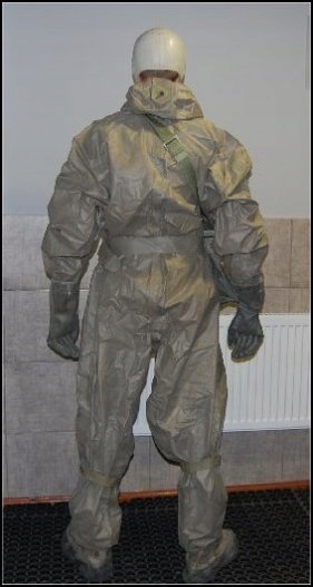 оригінальний цільний військовий хімічний захисний позов. Костюм виготовлений з дуже міцної і довговічної тканини, згортання з обох боків, і водяний гермети . Він призначений для захисту шкіри від наслідків хімічних та біологічних агентів війни.