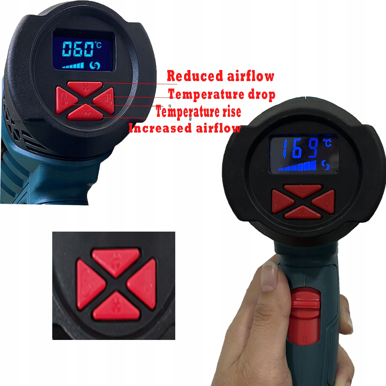 - Інтелектуальний центральний процесор із графічним графіком і пам’яттю Коли пристрій вимкнено, він відраховує 10 секунд, щоб побачити виділення тепла, тому пристрій можна швидко охолодити. Функція пам'яті призначена для людей, які часто використовують нагрівальну гармату при одній і тій же температурі, що дозволяє підвищити ефективність роботи без налаштування температури.