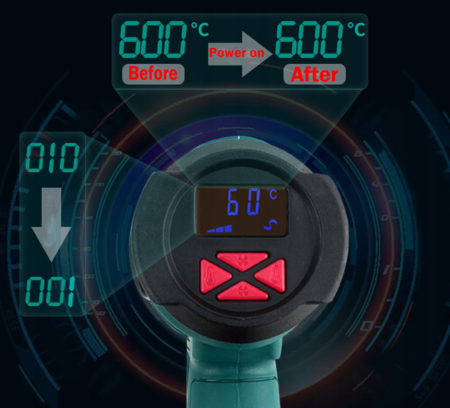 - Цей фен має РК-синій світло високої роздільної здатності, який можна сприймати за температурою та відправляти в повітря в темряві та точно в певний час. Діапазон контролю температури в природному середовищі становить 60 ~ 650° C