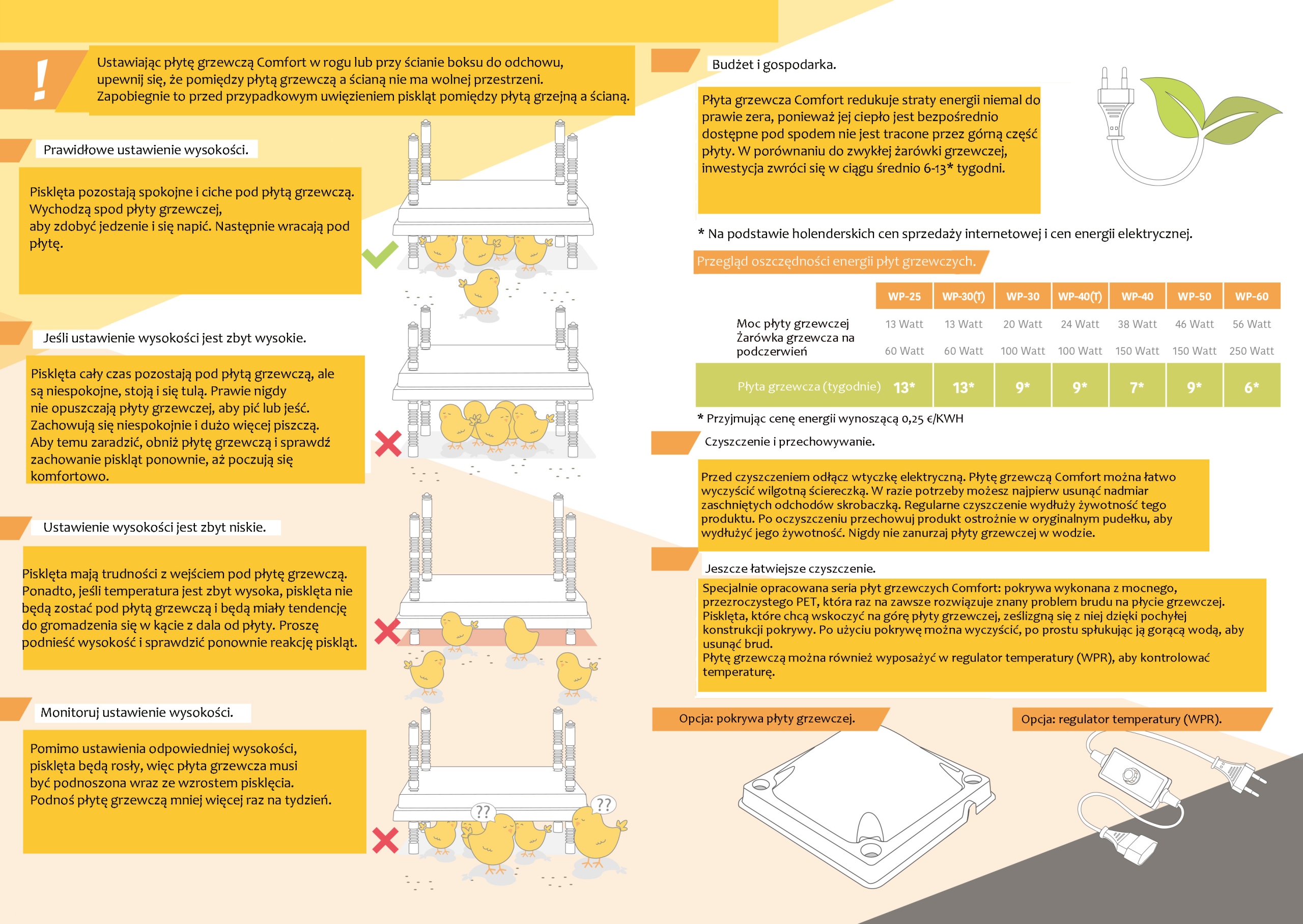 триватиме до 10 років, це безпечно використовувати, надійно і споживає дуже мало енергії. Завдяки високоякісній ізоляції PIR на верхній стороні пластини, тепло, що утворюється, буде текти лише до пташенят на дні нагрівальної пластини. Порівняно з нагрівальною цибулиною, різниця в споживанні енергії настільки велика, що ціна придбання опалення пластини може бути повернена протягом 8 - 20 тижнів.
