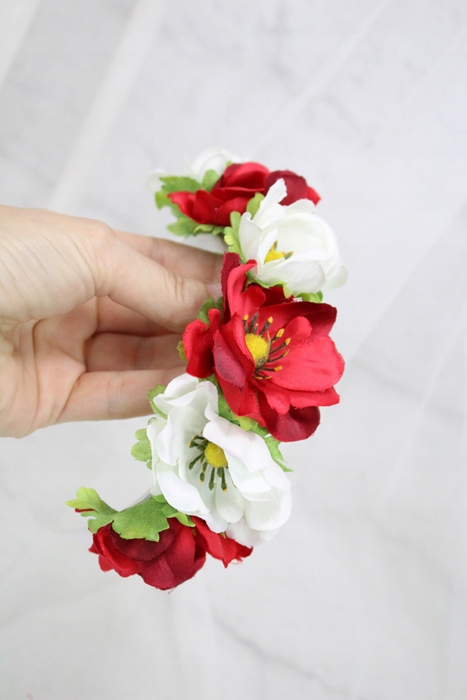 Надзвичайно красива пов'язка на голову, виготовлена з ледь блискучих атласних маків білого та червоного кольорів, делікатно прикрашена листочками.