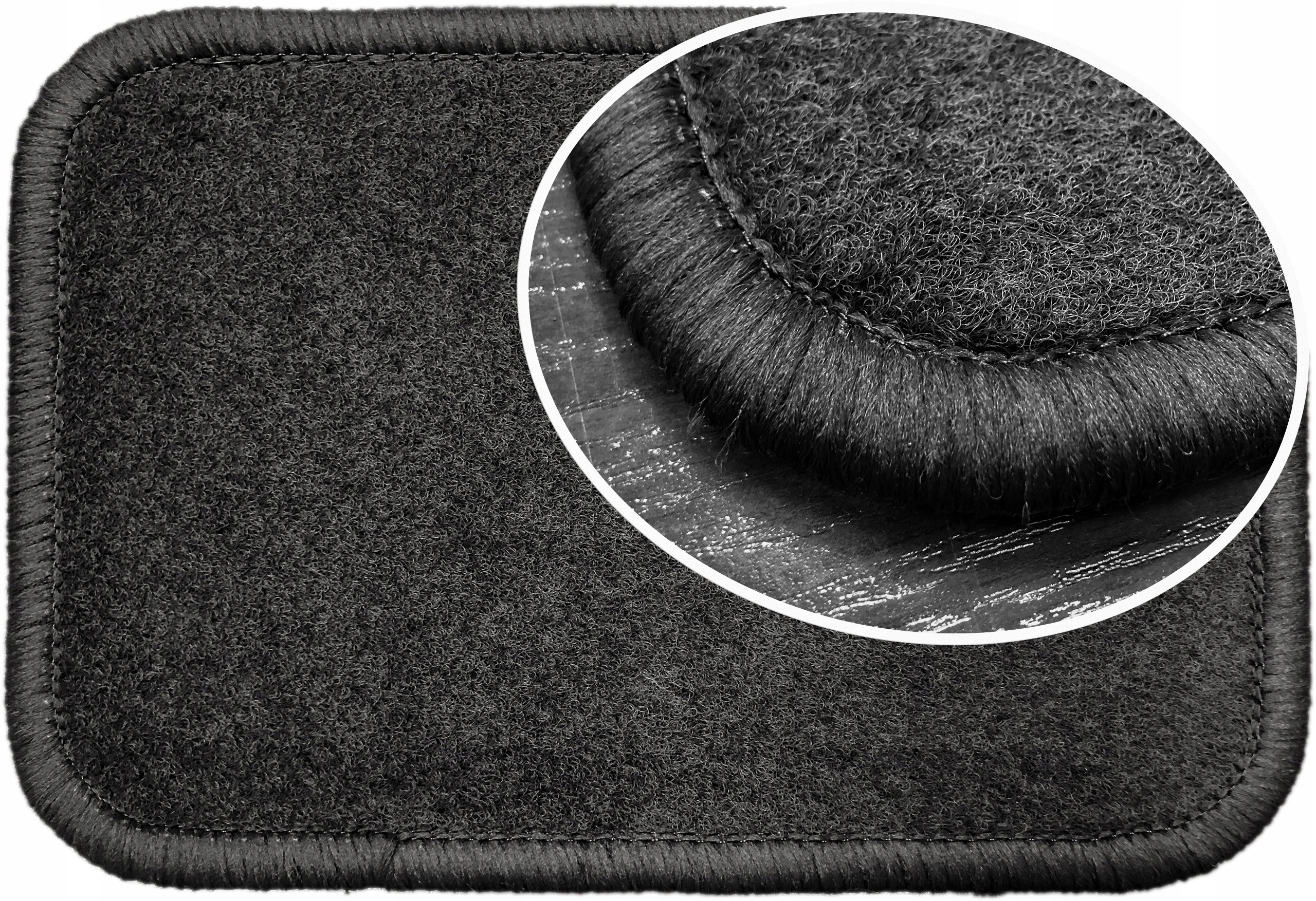 Пропоновані килимки виготовлені з петлевого ковроліну щільністю 2000г/м3 і товщиною матеріалу поперечного перерізу 6-7 мм. Нижній шар захищений грубою гумовою масою, яка захищає оригінальну оббивку автомобіля від вологи та додатково захищає килимки від зсуву. Водійський килимок має додаткове посилення на лінії педалей, яке захищає від стирання в критичній зоні (місце, де п'ята зустрічається з килимком). Килимки зшиті високоякісною поліпропіленовою пряжею (ниткою), яка надає килимкам естетичної обробки, а їх форма ідеально відображає форму підлогової плитки. На килимках також є вишитий напис спеціально укріпленими нитками, завдяки чому килимки виглядають дуже елегантно в автомобілі.