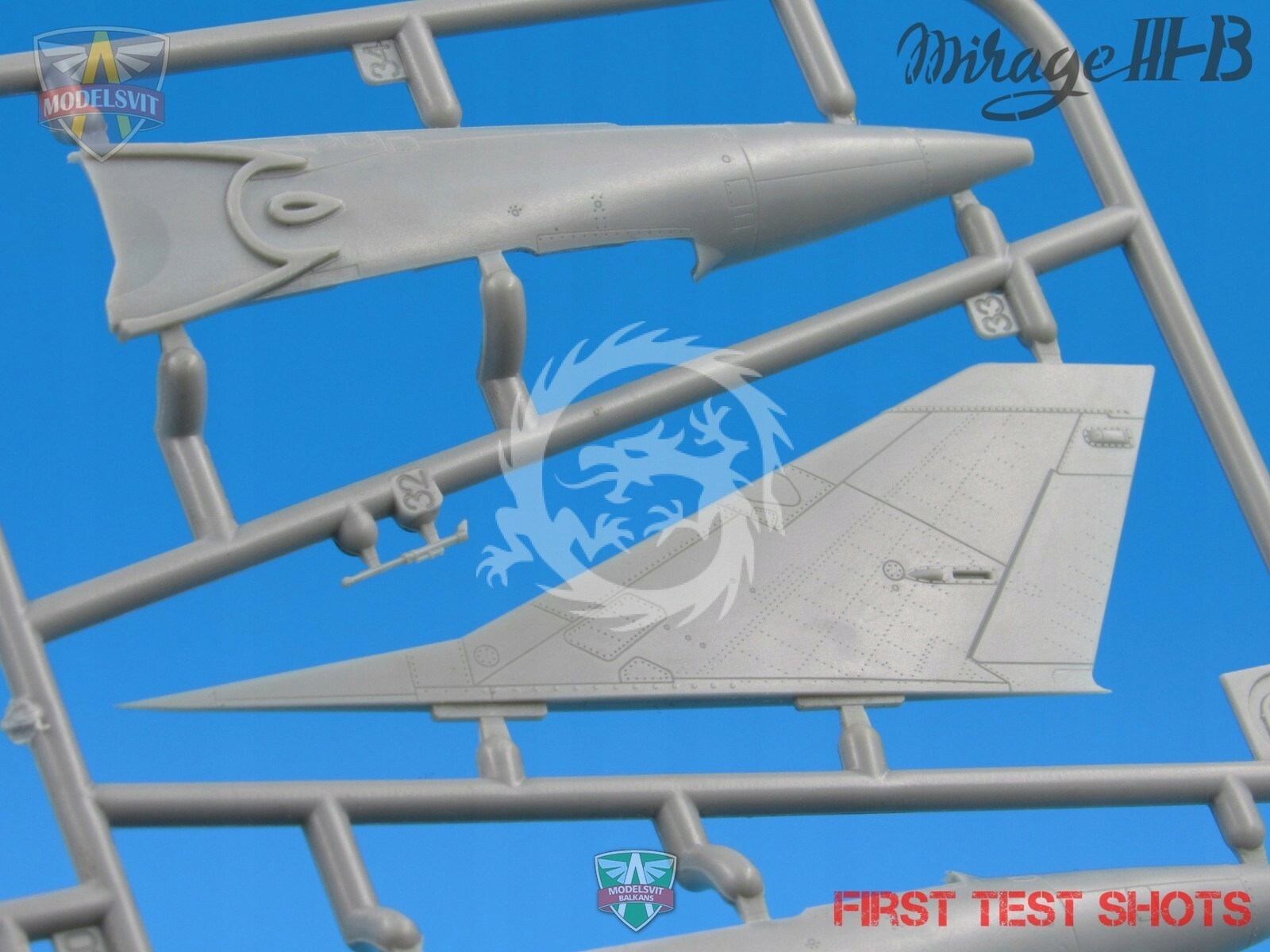 Пластикова модель французького навчально-тренувального літака Dassault Mirage IIIB, МодельСвіт, масштаб 1/72. У набір входять: сім литників з деталями моделі; фототравлена пластина; фольги з елементами прицілу; вінілові маски; деколь-лист з п'ятьма варіантами маркування; посібник, загальна кількість частин 162, масштаб 1/72.