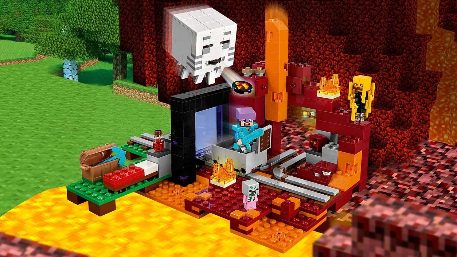 - З пейзажем Minecraft™ Nether із порталом, полум’ям, грибами та функцією лавового падіння – все це побудовано з цегли, а також шахтний візок і поворотна доріжка .