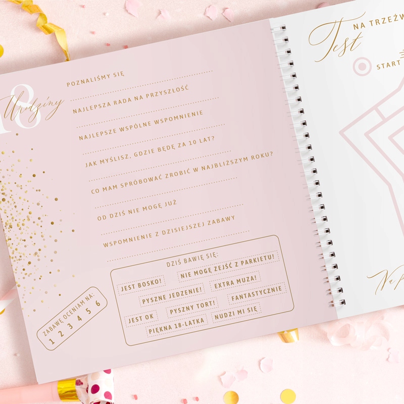 Гостьова книга із завданнями до 18-річчя — це вишукано оформлений альбом, який містить 50 окремих аркушів анкет. Кожен аркуш ретельно виготовлено з високоякісного паперу, що забезпечує довговічність та естетичний вигляд.