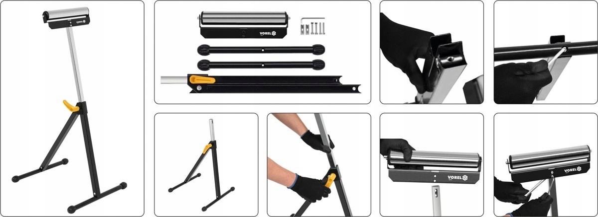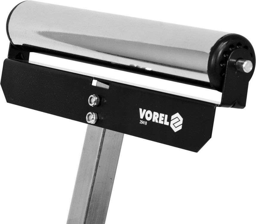 Металева опора з транспортуючим роликом / роликом / для підтримки довгих елементів під час обробки / наприклад, на столі пилки або фрезерного верстата /. Допустиме навантаження: бл. Висота опори регулюється від 68 до 105 см, ширина рулону 29 см. Ніжки з оцинкованого та лакованого сталевого листа, профіль 30 х 30 мм.