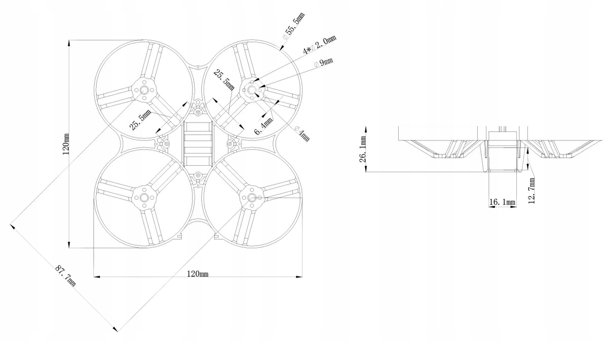 Специфікація Матеріал: PP Колісна база: 87,7 мм Монтажний отвір двигуна: 110 двигунів, таких як двигуни 1103 11000KV Монтажний отвір FC: повністю сумісний із схемою кріплення плати FC, 26 мм x 26 мм Вага: 11,32 г