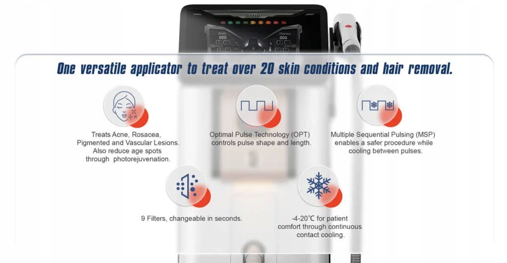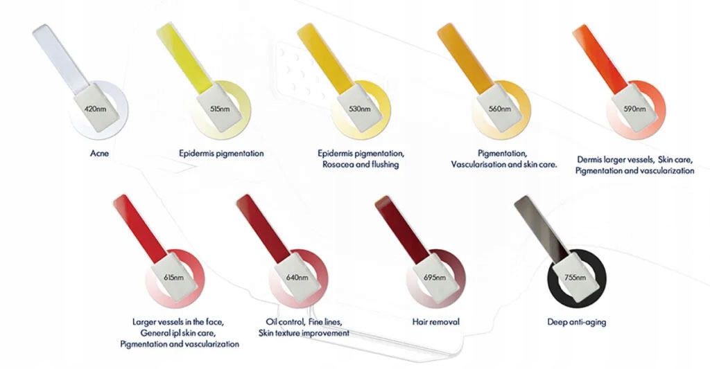 Сучасний косметичний апарат, що використовує новітню технологію IPL, що забезпечує точне омолодження шкіри, зменшення зміни кольору, лікування акне та судинну терапію. У набір входить 9 лікувальних фільтрів