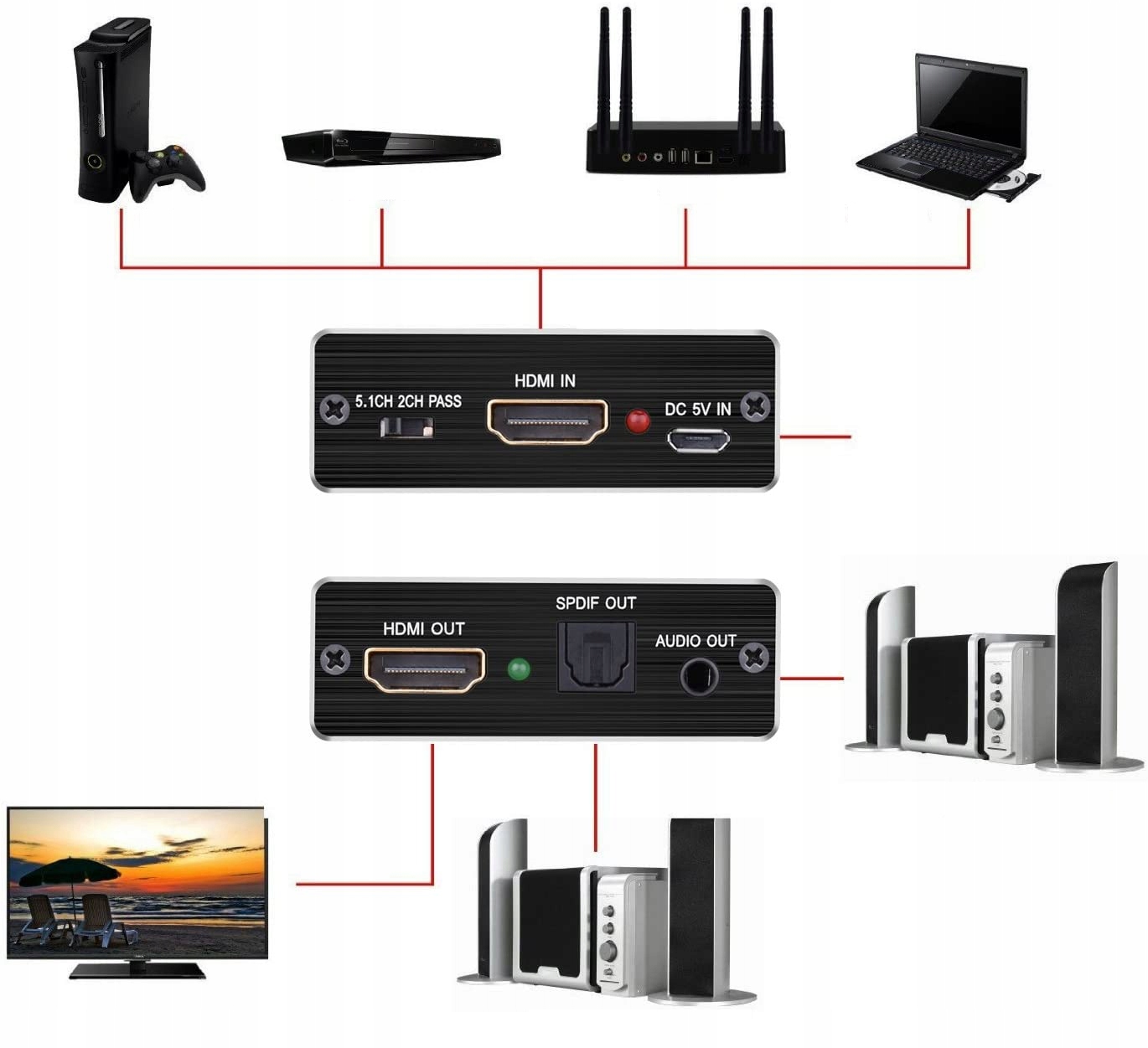 - HDMI Audio Extractor виводить аудіоформат Dolby True-HD, DTS-HD, AC3, DTS, DSD, але не може декодувати ці аудіоформати. Якщо ваш пристрій не підтримує ці аудіоформати, установіть аудіоформат у джерелі HDMI на аудіоформат PCM/LPCM.