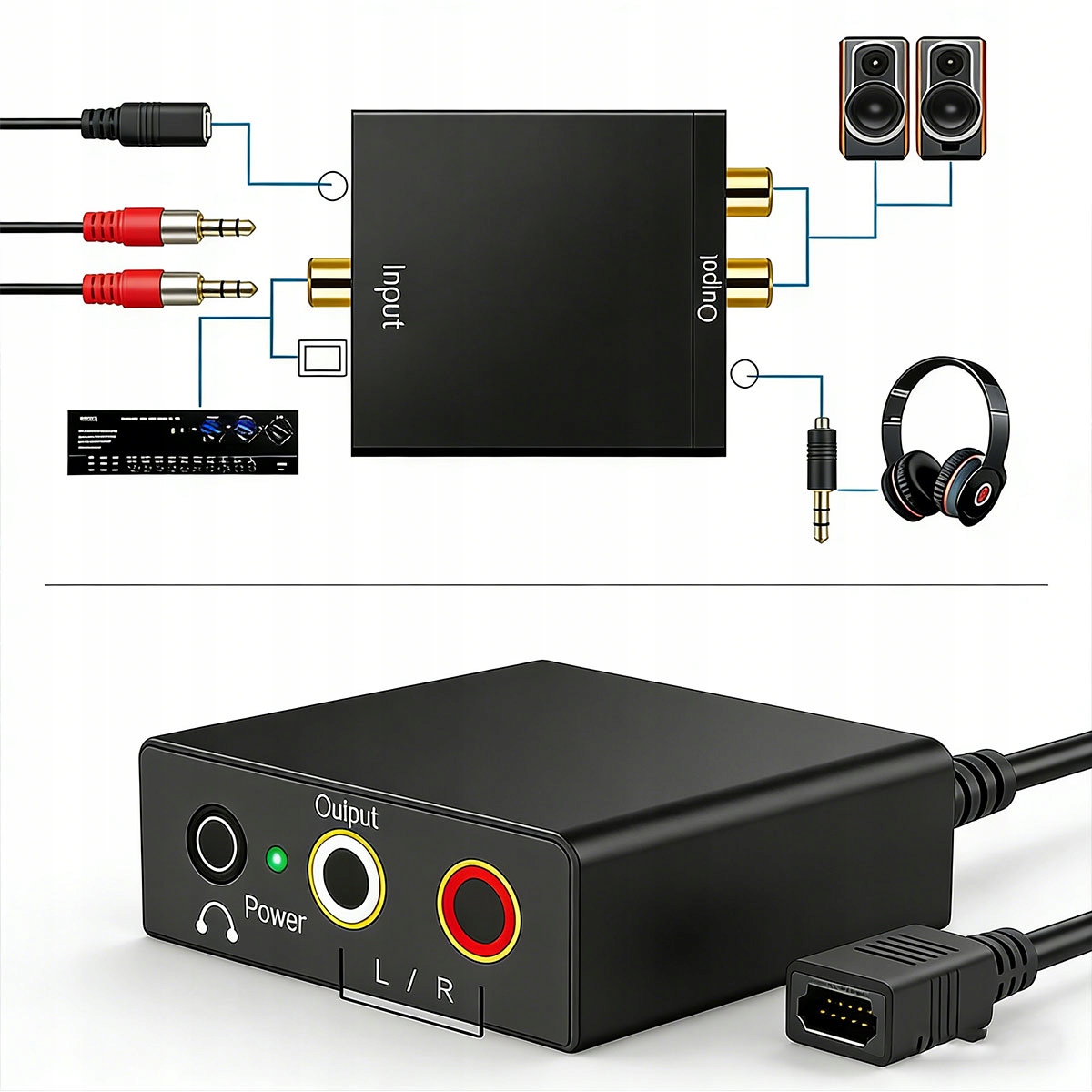 - Перетворює цифрові коаксіальні або оптичні аудіосигнали на аналоговий L/R аудіо.