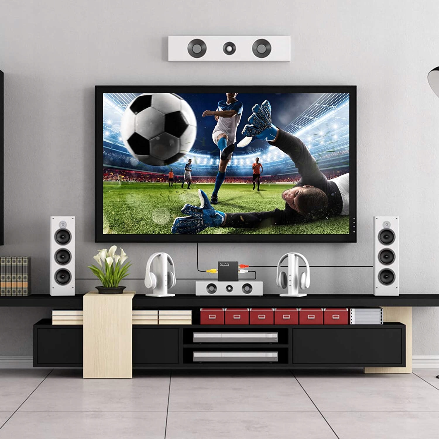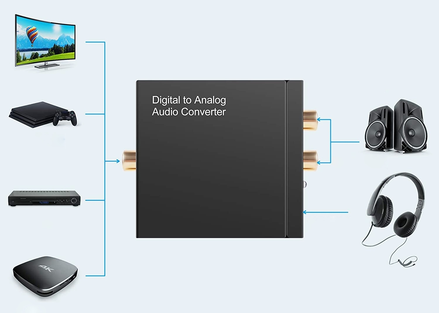 Одночасно перетворює цифровий коаксіальний аудіосигнал PCM або toslink на аналоговий RCA L/R і аудіороз’єм 3,5 мм (не працює навпаки).