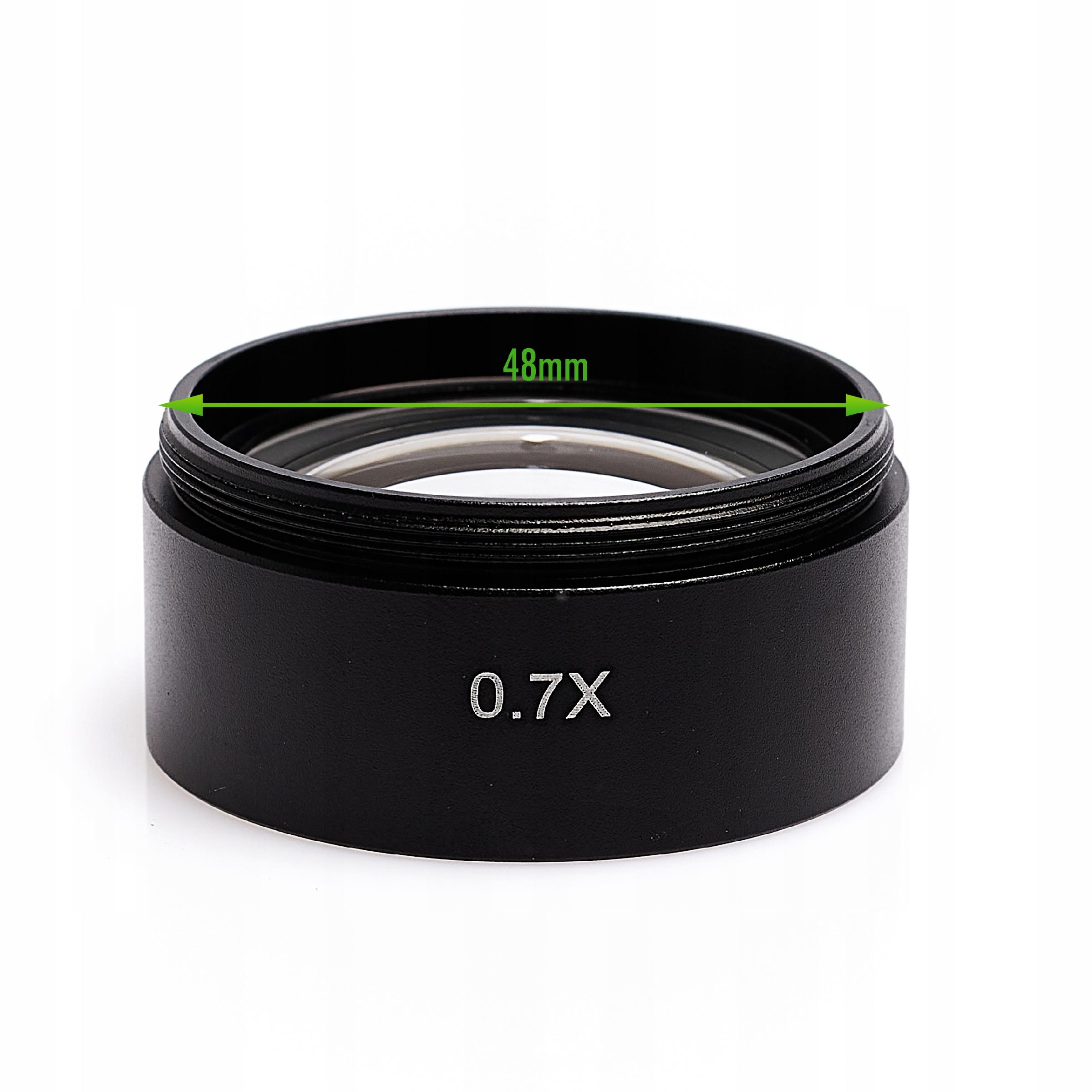 0,7x об'єктив для стереоскопічних мікроскопів з нашої пропозиції. Він використовується для збільшення діапазону збільшення. Об'єктив встановлений через нитку на нижній стороні стереоскопічної головки.