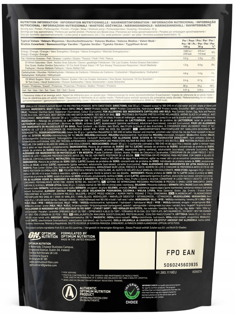 Gold Standard Whey містить 3 фракції сироваткового білка. Найбільшу частку займає ізолят сироваткового білка, потім концентрат і гідролізат. Це 3 білкові фракції, які найкраще використовуються організмом і характеризуються найвищою біодоступністю. Гідролізати та ізоляти відрізняються швидким всмоктуванням, концентрат буде вивільнятися трохи довше, поступово забезпечуючи амінокислоти.