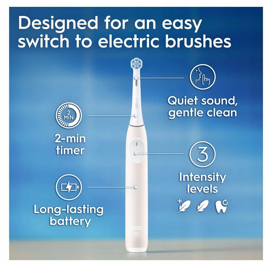 - Електрична зубна щітка Oral-B IO Series 2 забезпечує відчуття професійного прибирання зубів у вашому домі. Завдяки технології IO, це важко для таблички, але в той же час делікатний для ясен. Автоматичний датчик тиску захищає ясна від надмірного тиску. Три режими очищення та двохвилинний таймер забезпечують ретельне очищення та видалення до 100% більше тартару порівняно з звичайною ручною щіткою. Інвестуйте у свою посмішку завдяки усному серії IO 2!