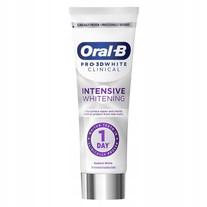 Клінічно доведено, що зубна паста Oral-B Pro 3D White Clinical Intensive Whitening відбілює зуби, видаляючи поверхневі плями з першого дня. Найкраща відбілююча зубна паста від Oral-B з унікальною іонною технологією: видаляє плями, не пошкоджуючи емаль, використовує технологію іонного відбілювання, захищає зуби від подальшого зміни кольору та підходить для чутливих зубів.