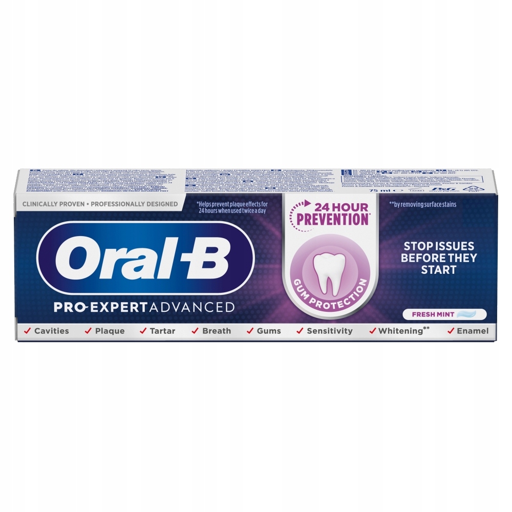Ефективність просунутої зубної пасти про вдосконаленої гумки ORAL-B, розробленої професіоналами, була клінічно доведена: запобігає проблемам перед тим, як вони з’являються, і допомагає захистити від бактеріальної пластини та прилипання до зубів та ясен протягом 24 годин при чищенні чищення двічі на день.