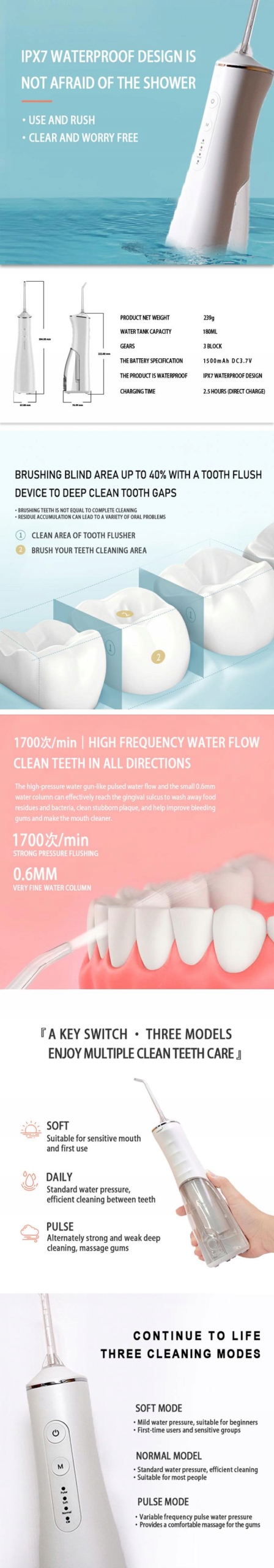 Ця стоматологічна водна нитка оснащена 4 режимами очищення. Нормальний імпульс для видалення менших молекул між зубами. М'який - підходить для початківців та чутливих зубів. Пульс - масажувати ясна. Зробіть це самостійно - ви можете самі встановити бажаний тиск. Інноваційна функція пам'яті допомагає підтримувати кращий режим для наступного використання, якщо ви встановите режим перед використанням. У тому числі 2 стандартні кінці насадок, 1 скребок язика та 1 наконечник пародонту, які можуть вирішити різні проблеми зі здоров’ям ротової порожнини, такі як неприємний запах з рота, карієс, кровотоки та жовті зуби. Обертова насадка на 360 ° дозволяє всім важко дістатися до областей, спійманих для очищення.
