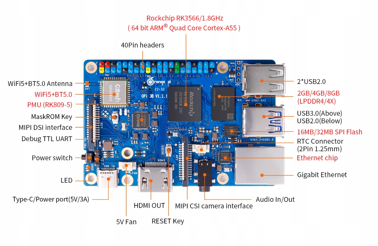 Orange Pi 3B 4-ядерний 4 ГБ Gigabit WiFi5 BT5.0 M.2
