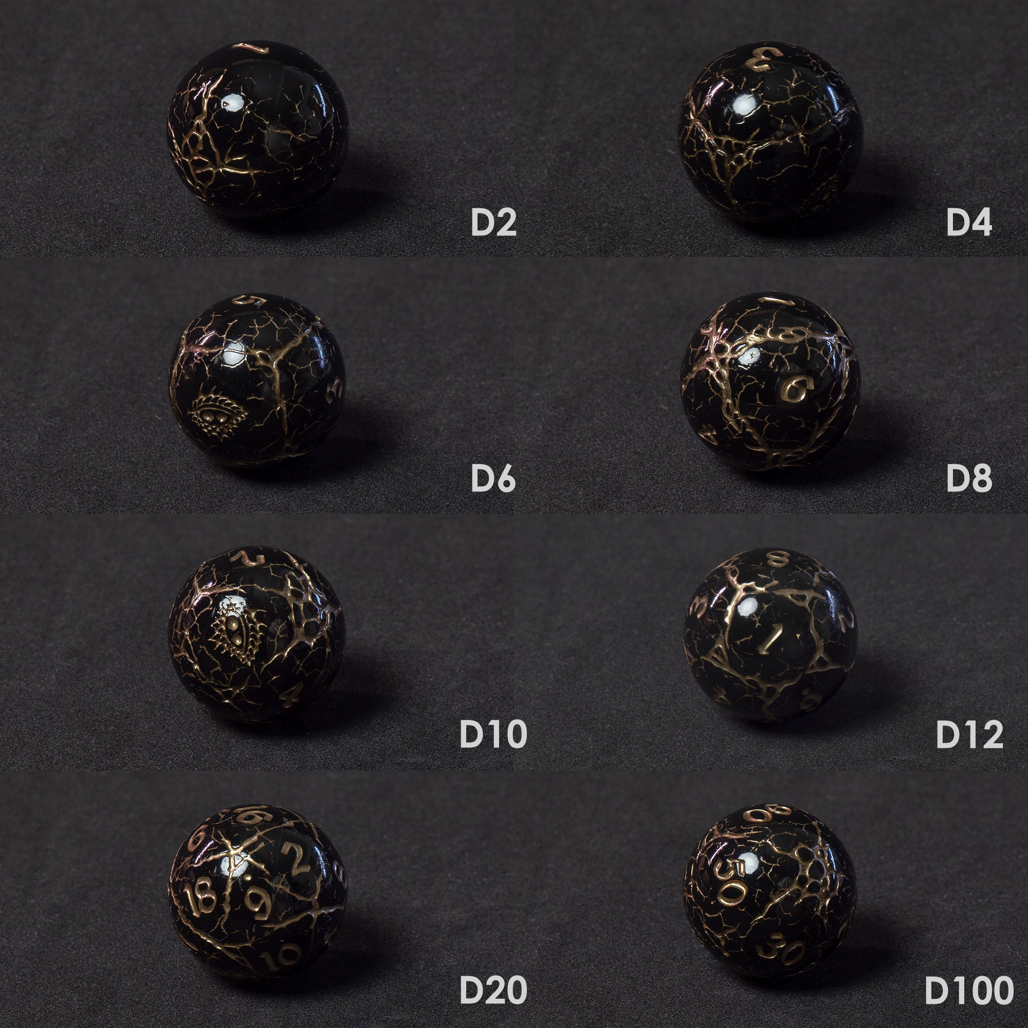 Кожен набір містить 8 кубиків: K2, K4, K6, K8, D10 (одиночні числа), D10 (десятки), D12 і D20.