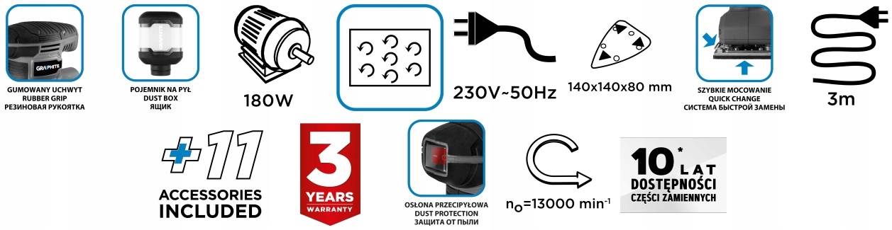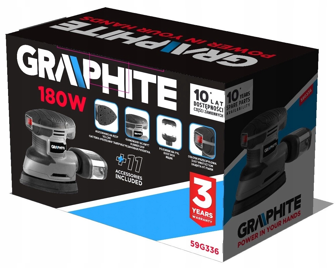 Дельта-орбітальна шліфувальна машина 180 Вт, основа 140 x 140 x 80 мм 59G336 від GRAPHITE – це інструмент потужністю 180 Вт із трикутною основою розміром 140 x 140 x 80 мм і сумісним наждачним папером 140 x 140 x 97 мм.